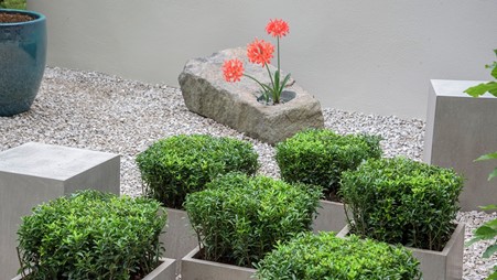 Projetado por Mika Misawa, um jardim para quem mora na cidade, mas que busca tranquilidade, com pequenos detalhes inspirados por tradições japonesas. Fragmentos da natureza – como a pedra e os pedriscos – contribuem para a sensação de calma.