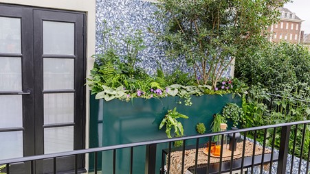 Projeto de Michael Coley. Projetado para uma pequena varanda em andar alto, o objetivo foi criar um refúgio nas alturas, permitindo a contemplação e o relaxamento em meio à agitação urbana. O paisagista buscou também mostrar que, mesmo sendo pequena, a área pode incorporar espaços com diferentes funções: lazer, refeições etc.