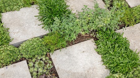 Temperos e outras plantas entre as pedras do piso.